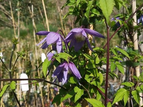 Elegantissima Clematis dalla fioritura primaverile precoce, in tonalità dal blu al violetto. Porta fiori singoli a 4 sepali, a forma di campanula aperta rivolta all’ingiù, larghi 4-5 cm. Ai fiori seguono frutti molto ornamentali, con molte 'piumette' bianco-grigie. Il fogliame, deciduo, è molto grazioso, le foglie sono composte da nove foglioline dal margine dentato. I fusti giovani sono di colore rossastro. Gruppo di potatura: 1.
