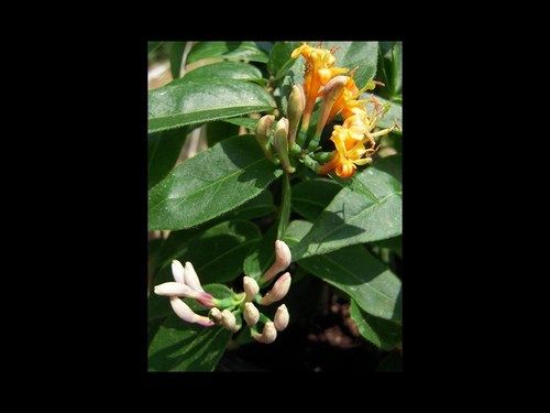 Fogliame semisempreverde opposto, dalla forma ovata, dalla superficie liscia e di color verde scuro. La fioritura va da aprile fino ad agosto. I fiori sono disposti a coppie, partono dall'ascella fogliare e sono disposti lungo la porzione più giovane dei rami. Nascono bianchi e diventano rapidamente gialli, creando sulla pianta un effetto bicolore, e sono molto profumati. Seguono la fioritura bacche blu scuro. Pianta vigorosa.
