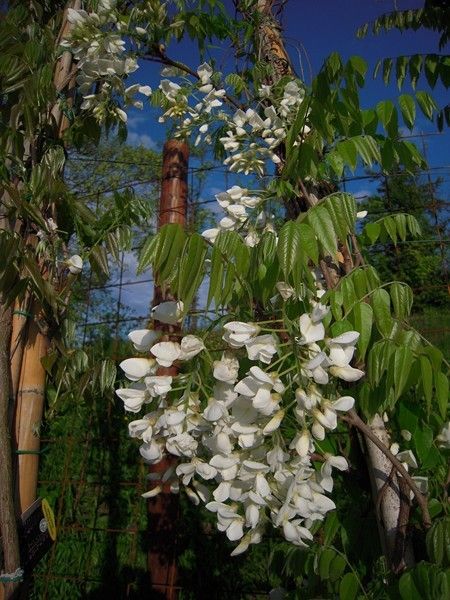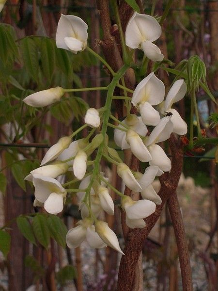 Singoli fiori tra i più grandi degli altri glicini, bianchi, profumatissimi.