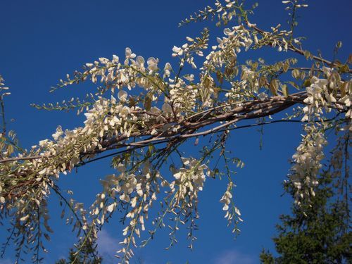 Bianco crema soffusi di rosa in grappoli lunghi 20/30 cm ad aprile. Leggera rifiorenza all'inizio dell'estate.
